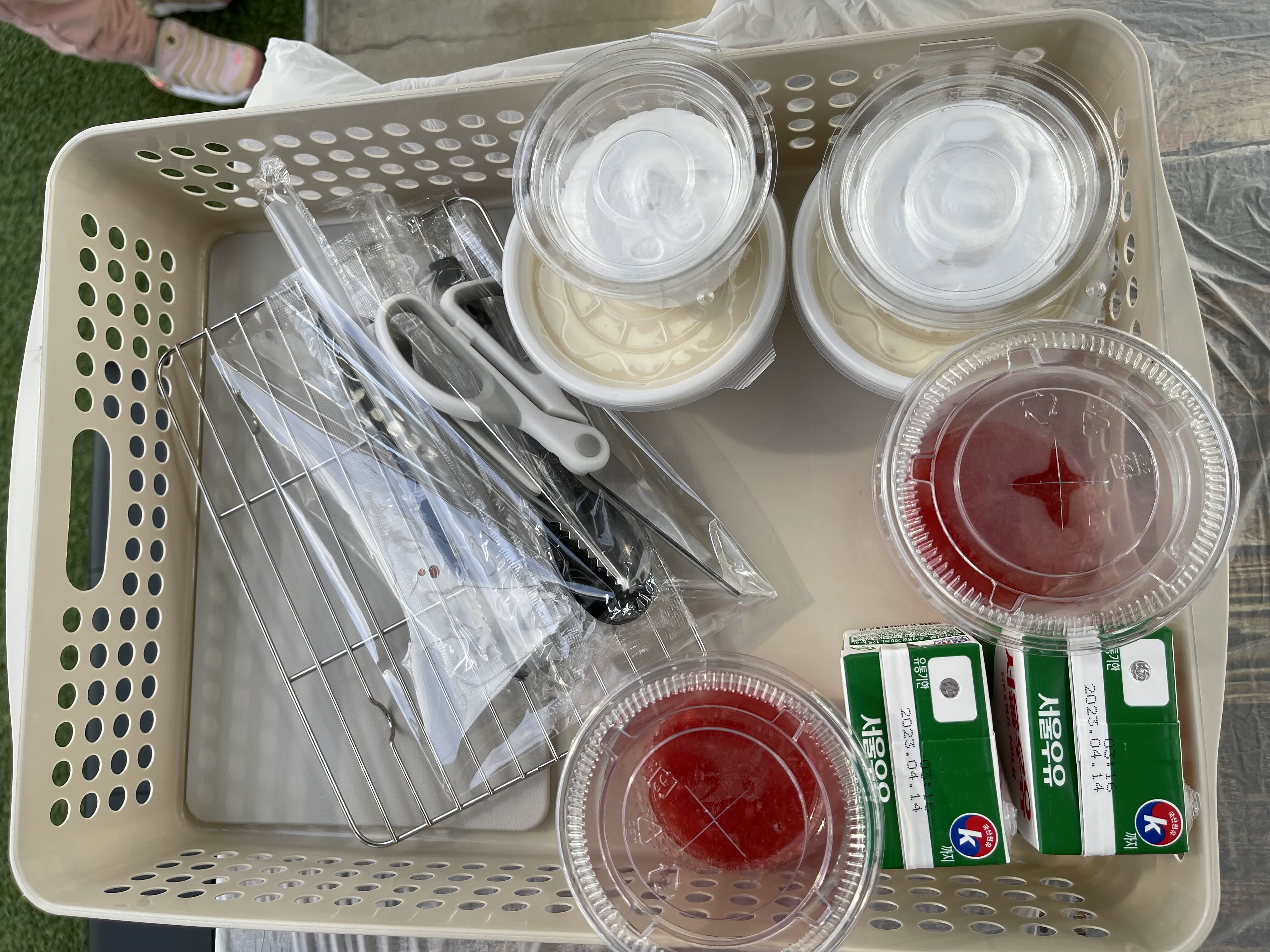 (딸기쨈, 와플반죽, 생크림, 우유, 집게, 가위, 칼 등등)