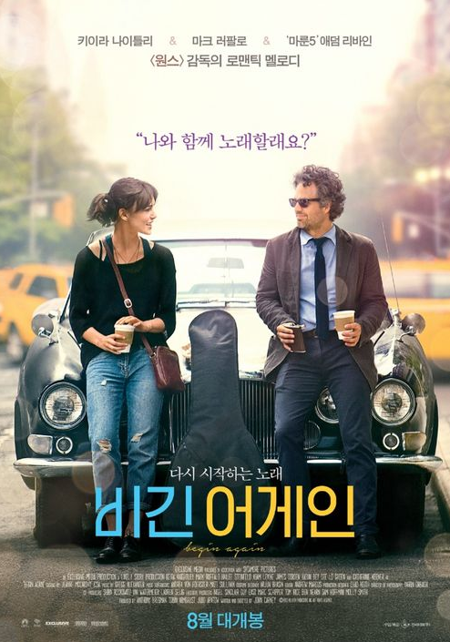 직업이 싱어송라이터인 그레타(키이라 나이틀리)와 음반프로듀서 댄(마크 러팔로)이 뉴욕 거리 곳곳을 돌아다니며 노래를 작곡하고 부르는 과정을 그렸다. 원스 이후 이렇다 할 음악영화가 없었던 중에 가뭄 속 단비와도 같은 작품이었다. 게다가 주연배우 키이라 나이틀리는 내가 제일 좋아하는 여배우중 한명이라 개봉 전부터 무척 기대됐다. 하지만 실제로 영화를 보고나니 예상과는 전혀 달랐다. 물론 좋은 점도 많았지만 아쉬운 부분이 더 많았던것 같다. 우선 스토리 전개가 매끄럽지 못했다. 두 주인공 사이에 벌어지는 갈등 구조가 지나치게 단순했고 개연성도 부족했다. 그러다 보니 극중 인물들의 감정선을 따라가기가 쉽지 않았다. 또 하나 아쉬웠던 건 OST 퀄리티다. 다양한 명곡들이 등장하긴 했지만 전체적으로 임팩트가 약했다. 개인적으로는 마룬5의 보컬 애덤 리바인이 부른 'Lost Stars'가 가장 좋았다. 마지막으로 결말부 연출이 아쉬웠다. 열린 결말로 끝맺음 했는데 여운보다는 허무함이 크게 느껴졌다. 차라리 깔끔하게 마무리 짓는 편이 나았을 거라는 생각이 든다. <비긴 어게인>은 음악영화라는 타이틀답게 다양한 노래가 등장한다. 주인공 그레타 역을 맡은 키이라 나이틀리가 직접 부른 곡 외에도 마룬5의 애덤 리바인, 마크 러팔로 등 쟁쟁한 뮤지션들이 참여하여 귀를 즐겁게 해준다. 개인적으로는 남주인공 댄이 딸 바이올렛에게 불러주는 자장가가 인상 깊었다. 가사 없이 허밍으로만 이루어진 곡인데 마치 엄마가 아기에게 속삭이는 듯한 느낌이었다. 그래서인지 듣는 내내 마음이 편안해지고 따뜻해졌다. 또 하나 기억에 남는 장면은 데이브 역할을 맡은 제임스 코든이 기타를 치며 부르는 Lost Stars다. 극중 싱어송라이터인 댄이 작곡한 노래이기도 하다. 비록 실제로는 자신의 연인이자 스타 프로듀서였던 데이브 앞에서 부르지는 못했지만 그래도 진심 어린 목소리만큼은 관객들에게 충분히 전달되었을 것이다.