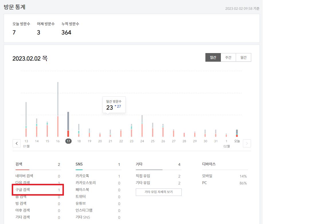 구글로봇이 다녀가면 흔적을 남긴다는 글을 보았는데, 방문통계에 들어가보니 구글검색에 1이 보였습니다.